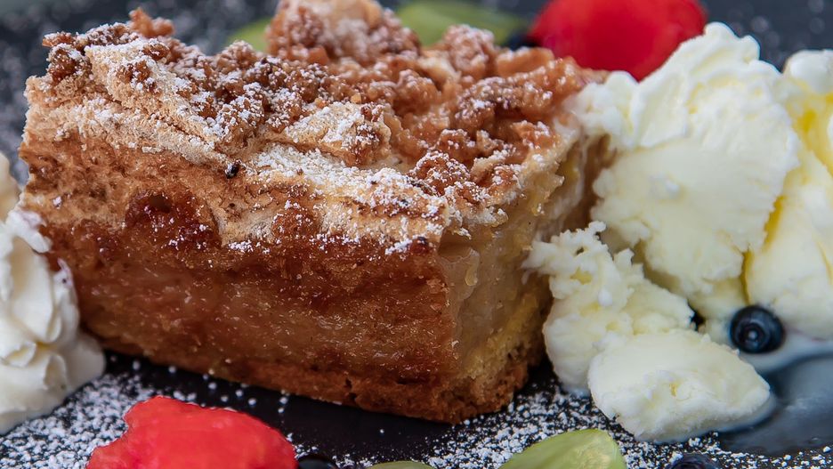 Kruche piernikowe ciasto łączy się tu z podduszonymi jabłkami zagęszczonymi kisielem, dzięki czemu masa jest zwarta i nie rozpływa się podczas krojenia. Całość dopełnia lekka, puszysta pianka budyniowa oraz chrupiący wierzch z tartego ciasta, tworząc pyszną szarlotkę o wyrazistym zapachu i przyjemnej, różnorodnej strukturze.