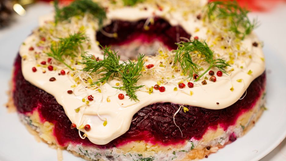 Buraki, ziemniaki oraz śledzie, odpowiednio ułożone w okrągłej formie i udekorowane majonezem i zielonymi gałązkami koperku wyglądają jak świąteczny stroik, ale w jadalnym wydaniu. To dowód na to, że nawet najprostsze danie może zachwycać nie tylko smakiem.