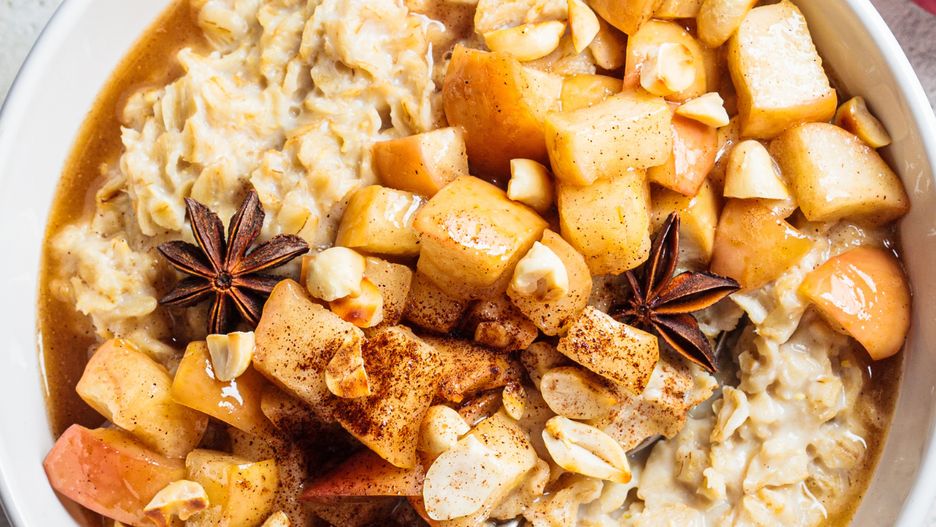- Gotową owsiankę przełóż do miseczki i wymieszaj z otartym na drobnych oczkach jabłkiem. Całość posyp orzechami włoskimi.