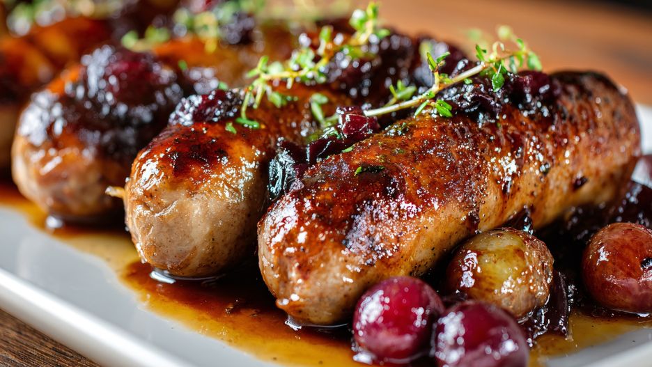 Elegancka biała kiełbasa duszona w winie z owocowym akcentem