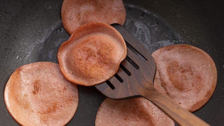 - W miarę podgrzewania, mortadela naturalnie wygnie się ku górze, tworząc idealne, złociste miseczki. Smaż, aż krawędzie będą chrupiące.
