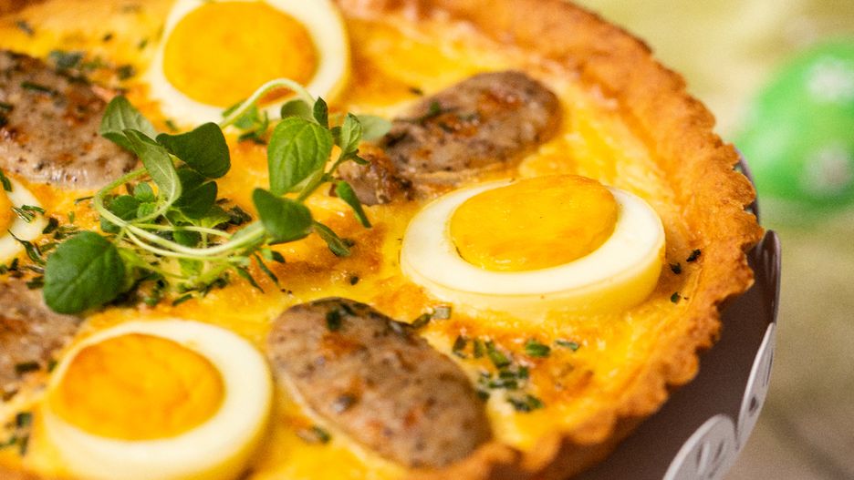 Szukasz pomysłu na ciekawe danie wielkanocne? Nasza tarta z jajkiem i białą kiełbasą sprawdzi się w tej roli idealnie. Nie sposób oderwać od niej wzroku!