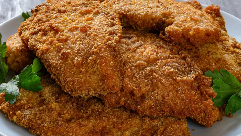 - Oprósz każdy kawałek mięsa papryką, solą i pieprzem. Po kolei obtocz je w mące, jajku i bułce tartej. Strzep nadmiar panierki, a resztę lekko dociśnij dłonią, żeby dobrze przylegała. Dzięki temu panierka będzie równomiernie chrupiąca i złocista.
