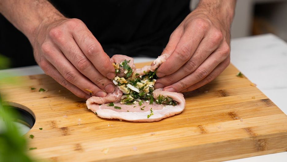 Krok 2: Plastry schabu rozwijam, wykładam porcję farszu i zawijam w roladki. Zabezpieczam je wykałaczką i obsmażam na rozgrzanym oleju lub maśle z obu stron, aby się zarumieniły.