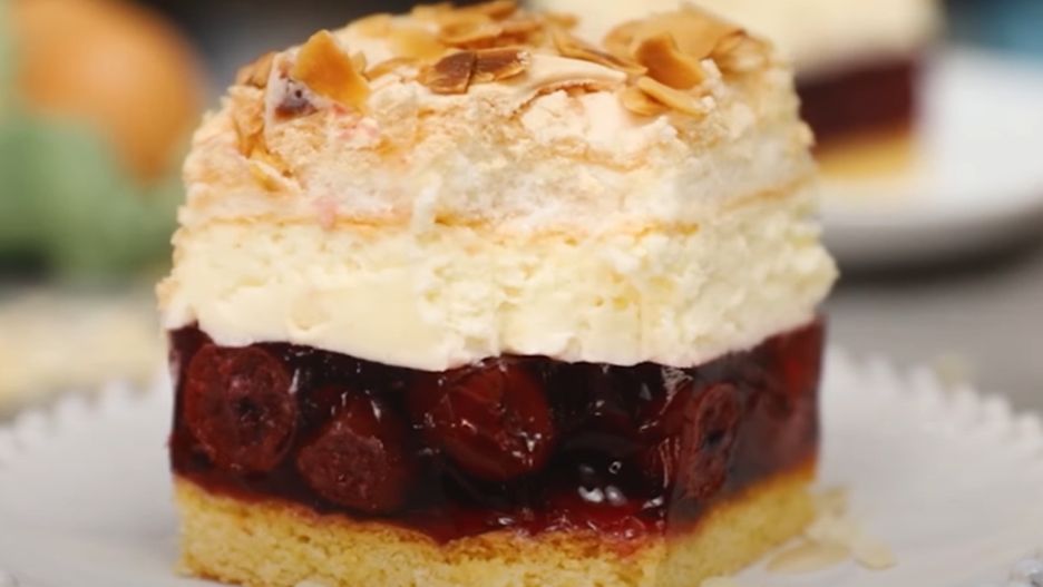 - Na warstwę śmietankową kładę bezę, lekko dociskam. Wierzch posypuje uprażonymi płatkami migdałowymi i gotowe.