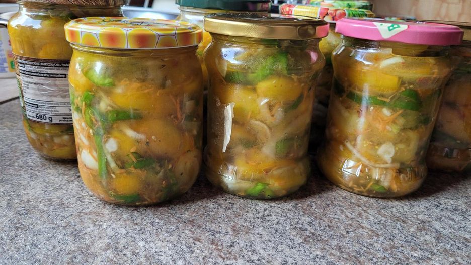 Okazało się, że zamiast nich dodałam żółte pomidorki gruszkowe, których krzaczki w tym roku wyjątkowo obrodziły. Świetnie połączyły się smakiem z papryką, cebulą i marchewką, a całość pasteryzowałam w miodowo-octowej zalewie. Jeden ze słoików postanowiłam otworzyć kilka dni po przygotowaniu, kiedy zorientowałam się, że doszło do zamiany. I zachwyciłam się smakiem delikatnych pomidorów, chrupiącej papryki i smakowitej cebulki. Marchewkę mogłam dodać w większej ilości, ale całość i tak wyszła znakomicie.
