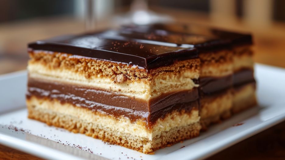 Sercem deseru są pyszne, kremowe warstwy przygotowane kolejno z dodatkiem kajmaku, budyniu śmietankowego i czekolady deserowej. Warstwa kajmakowa powstaje na bazie bitej śmietaną i serka mascarpone, waniliowa to klasyczny krem budyniowy, a czekoladową tworzy ganache wymieszany z masłem.