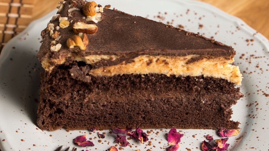 Zamiast kilku małych deserów przygotuj ciasto, które skradnie serca wszystkich gości. Pomiędzy mocno czekoladowymi blatami znajdują się aż dwie warstwy kremu – jedna czekoladowa, a druga o smaku orzechowym. Porcja takiego ciasta podczas imprezy andrzejkowej pozwoli ci bawić się do rana.