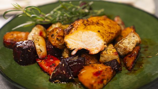 - Po wyjęciu mięsa i warzyw z piekarnika serwuj je razem.