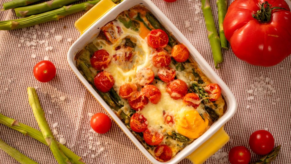 Szparagi zapiekane z pomidorkami i jajkiem. W sam raz na majówkę