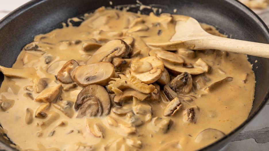 Większość z nas do zabielania sosu pieczarkowego używa śmietany 12 lub 18 proc., która pod wpływem temperatury potrafi się rozwarstwić. Oczywiście możesz ją zahartować, ale pod wpływem redukowania sosu znowu mogą pojawić się grudki. Serek mascarpone zawiera o wiele więcej tłuszczu, a przy tym ma jednolitą strukturę, dzięki czemu idealnie łączy się z innymi składnikami sosu.