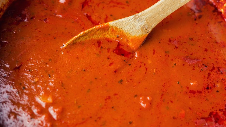 - Dopraw płatkami chili, suszonym oregano, pieprzem i szczyptą soli, gotuj dalej na małym ogniu przez kolejne 10 minut, mieszając co kilka minut, by sos się nie przypalił.
