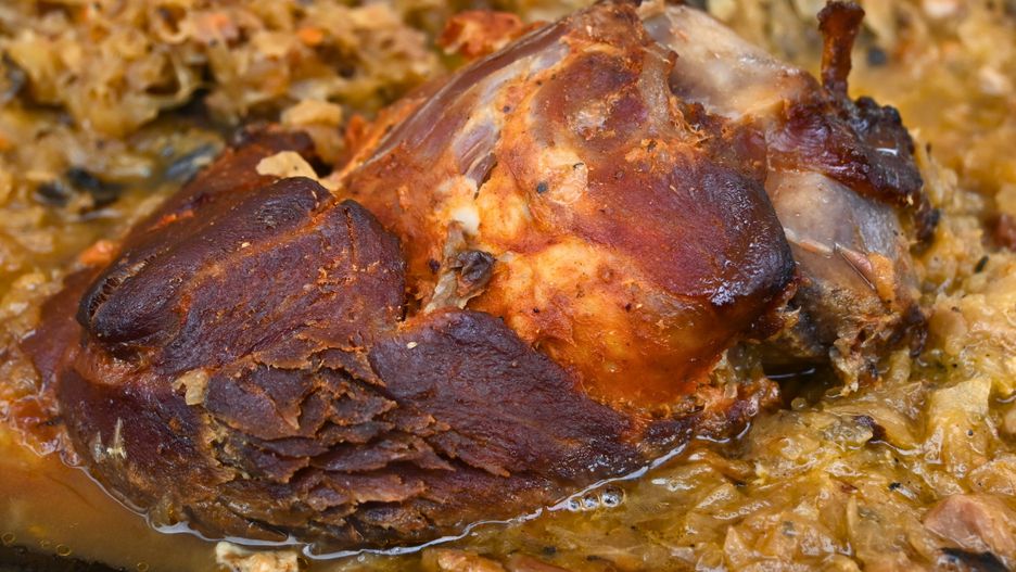 Pieczona golonka to danie, które w Niemczech, a szczególnie w Bawarii, uważa się za ikonę kuchni domowej. Jest z nią trochę jak z naszym bigosem — potrawa niby ta sama, ale każda gospodyni robi ją nieco inaczej. Ten przepis bazuje nie tylko na samym mięsie, ważną rolę odgrywa tutaj kapusta kiszona, która pod wpływem długiego pieczenia lekko karmelizuje się i chłonie wytapiający się z golonki tłuszcz. Dzięki temu procesowi traci swoją surową kwasowość, zyskując głęboki, niemal maślany smak, który idealnie balansuje sycącą i tłustą wieprzowinę.