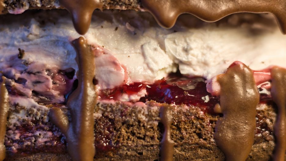 - Wystudzony biszkopt podziel na dwie części: na jednej rozsmaruj dżem porzeczkowy, następnie wyłóż bitą śmietanę i całość przykryj drugim biszkoptowym blatem. Polej całość czekoladową polewą.