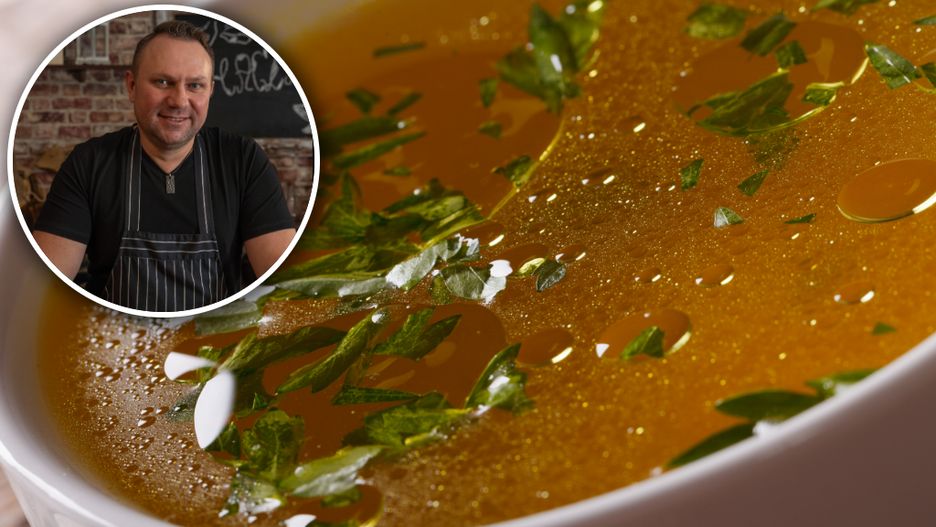 Tomasz Strzelczyk dodaje do rosołu. Jego zupa wychodzi esencjonalna i pełna smaku