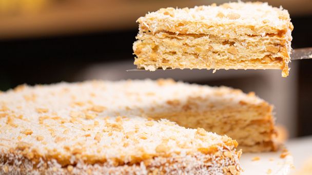- Przed podaniem udekoruj tort masą kajmakową, orzeszkami ziemnymi i wiórkami kokosowymi.