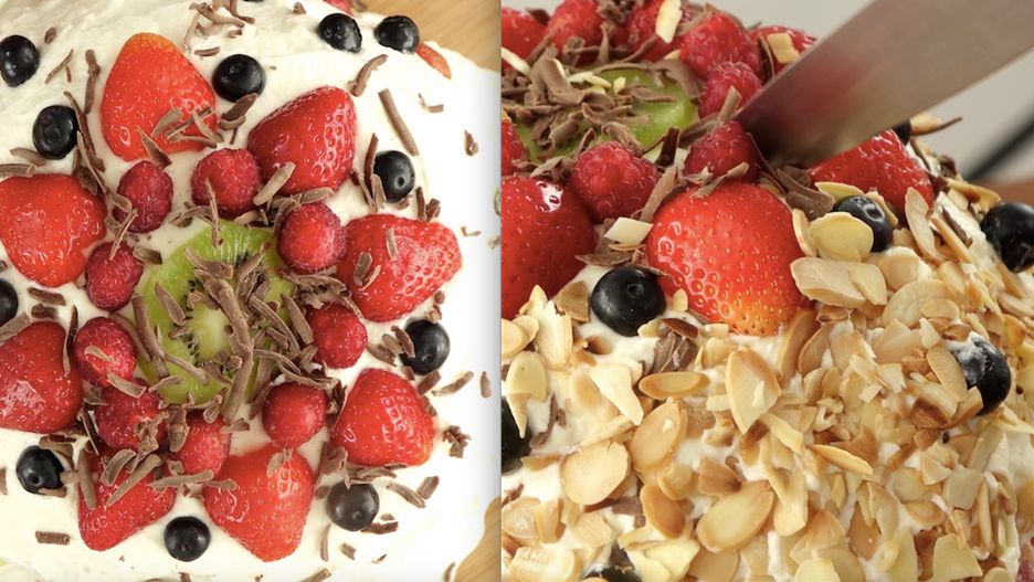 5. Poukładaj owoce na torcie. Tutaj opcji jest wiele - każdy może ułożyć je w własny, unikalny sposób. My zrobiliśmy to tak:
