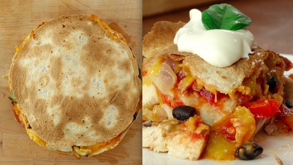 4. Wykonuj kolejne warstwy w tej samej kolejności tak długo, aż nie zapełnisz całej blaszki. Zacznij ponownie od placka tortilli. Pamiętaj, że na samej górze ciasta musi znajdować się również placek tortilli. Kiedy blaszka będzie w całości zapełniona, włóż ją do piekarnika rozgrzanego do 180 stopni C. Piecz przez 15 minut.