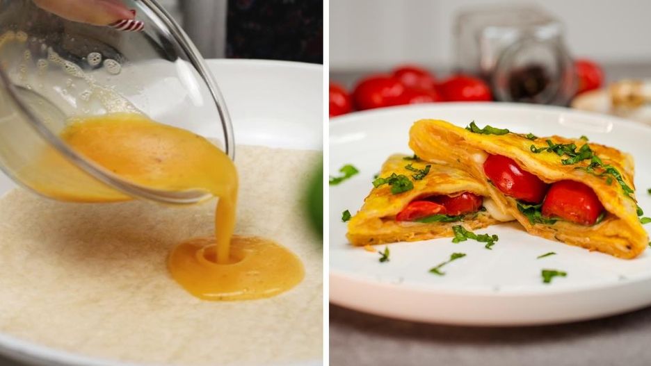 Szybka tortilla śniadaniowa z mozzarellą i pomidorami. Prosty przepis na danie z patelni