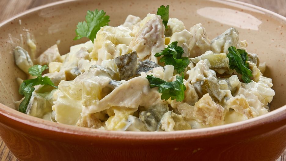 Ta sałatka jest zdecydowanie ulubienicą mojego dziadka. Zawsze sięga po nią w pierwszej kolejności i nazywa sałatką z pięciu składników, chociaż w rzeczywistości do przygotowania jej potrzebujesz do niej nieco więcej produktów. Jednak to właśnie te pięć składników – kurczak, ziemniaki, marchewka, zielony groszek i jajka – odgrywają tu główną rolę.