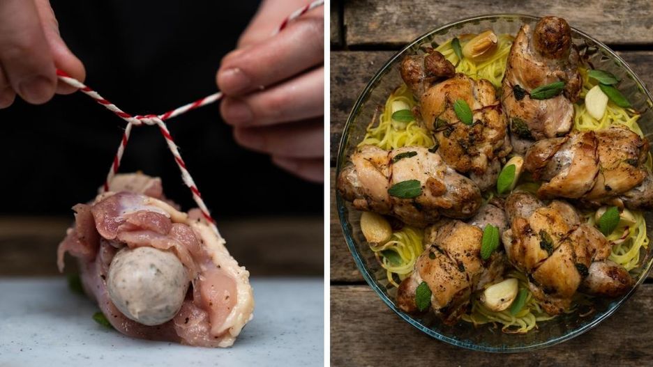 Następnie umieść na desce kawałek sznurka wędliniarskiego. Na środku ułóż świeżą gałązkę szałwii, po czym przykryj ją doprawionym udkiem z kurczaka bez kości. Na koniec dodaj białą kiełbasę i złóż wszystkie składniki w jedną konstrukcję.