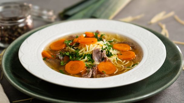 Jak wydobyć najlepszy smak z rosołu? Odpowiedź jest prosta - gotować go powoli, z dobrej jakości mięsa, z klasycznymi przyprawami i porcją włoszczyzny. W tym przepisie najważniejsza jest gęsina; w sezonie to mięso zasługuje na szczególną uwagę. Kroki przygotowania sprawdzisz na wideo, a listę składników znajdziesz poniżej.