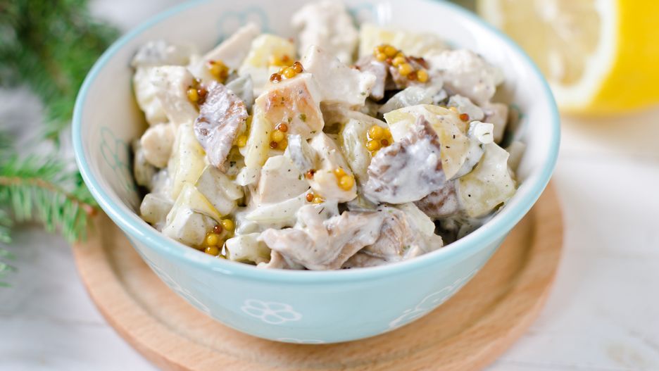 Ugotowane ziemniaki w kontekście sałatek kojarzą się przede wszystkim z sałatką jarzynową. Ale jeśli ugotujesz ich więcej, koniecznie zrób drugą propozycję, którą podasz w pierwszy i drugi dzień Świąt. W połączeniu z wędzonym kurczakiem i majonezowo-musztardowym sosem będą smakować doskonale.