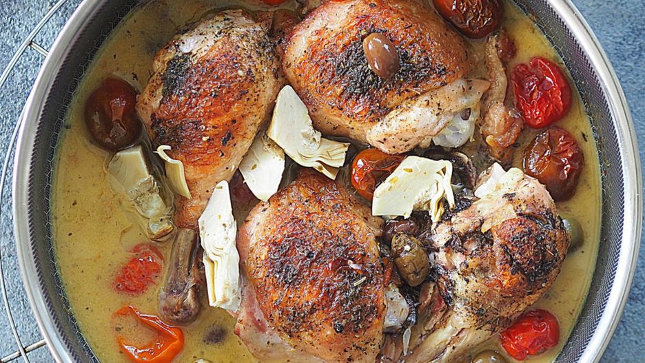 - Zdejmij pokrywkę, polej kurczaka sokami z patelni i piecz przez kolejne 20-25 minut, aż kurczak będzie miękki i zrumieniony. Podawaj z ryżem, ziemniakami, fasolą cannellini, z chrupiącym chlebem do maczania.