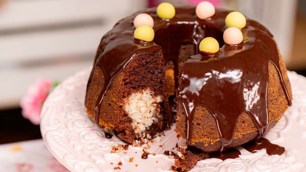 - Jak złożyć babkę a la bounty? Masę czekoladową podziel na pół. Przełóż pierwszą część do formy, dodaj kokosowe nadzienie i przykryj je ciastem.