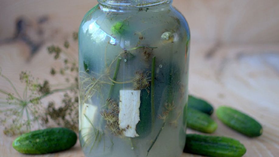 - W ciepłej wodzie rozpuścić sól, wymieszać z żurkiem. Zalać ogórki wodą z żurkiem.