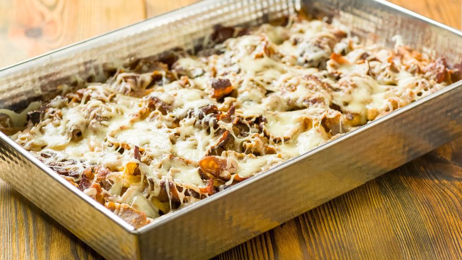 - W formie do pieczenia ułóż frytki, na nich kurczaka, a wszystko przysyp serem. Zapiecz w piekarniku do rozpuszczenia się sera.
