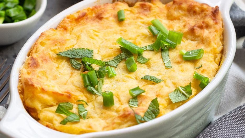 - Po upieczeniu wyjmij zapiekankę z piekarnika i odstaw na kilka minut do ostygnięcia. Podawaj na ciepło, posypaną szczypiorkiem.