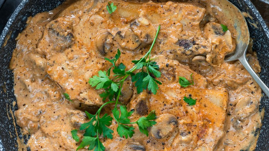Kiedy w domu wszyscy mają ochotę na schabowe, ale już nikt nie chce panierki i smażenia, robię tę wersję. Mięso miękkie i delikatne, sos gęsty i aromatyczny, a pieczarki i por dodają smaku.