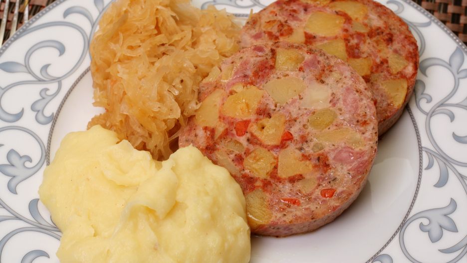 Żołądek wieprzowy służy tylko jako osłonka. W środku znajduje się farsz z mięsa wieprzowego, wędzonego boczku i ziemniaków. Te warto wcześniej ugotować w mundurkach – wtedy zachowają zdecydowanie więcej smaku.