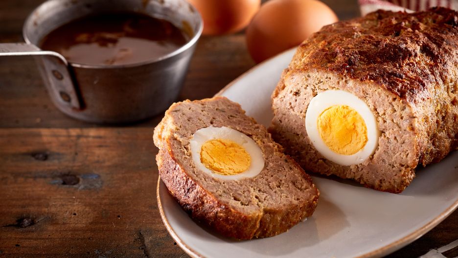 - Na mięsnej warstwie ułóż rząd z 4 jajek ugotowanych na twardo, po czym przykryj go kolejną warstwą mięsa.