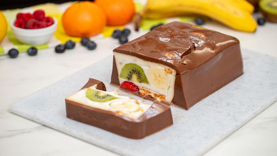 Na zewnątrz wygląda jak zwykłe ciasto pokryte grubą warstwą polewy czekoladowej. Po przekrojeniu pojawia się pyszna śmietankowa masa z owocami. Ten deser robi wrażenie, jednak niech cię nie zwiedzie jego wygląd - jest bardzo proste. Do przygotowania masy używam agaru, dzięki czemu skusić się mogą na niego wegetarianie. Jeśli jednak nie znajdziesz go w sklepie, możesz sięgnąć po klasyczną żelatynę wieprzową. Na 1 łyżeczkę żelatyny przypada od 0,5 do 2 łyżeczek agaru. Deser wygląda pysznie, a składniki bez problemu znajdziesz w każdym sklepie.