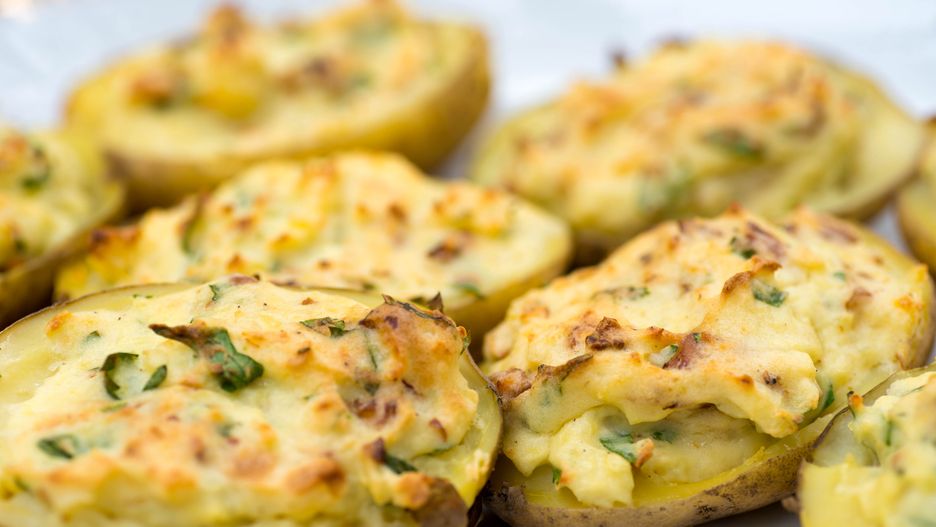 - Tak przygotowanym farszem wypełnij wydrążone połówki ziemniaków. Ułóż ziemniaki w naczyniu żaroodpornym.