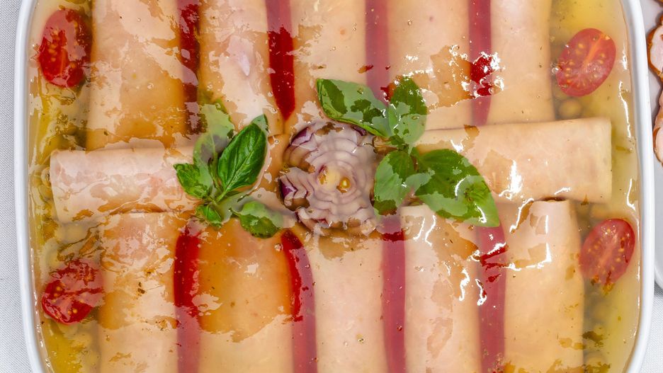 Wędliny i ryby w galarecie wyglądają efektownie na świątecznym stole. Obok głównej przekąski zawsze warto położyć dekoracyjny dodatek – w latach 90. popularne były rozety z marchewki, ogórka lub rzodkiewki. Każdy chciał się nauczyć je wycinać, a modne wówczas tele-zakupy zbijały fortunę na sprzedaży potrzebnych akcesoriów. Dzisiaj bardziej doceniane są klasyczne kształty – cienkie plasterki rzodkiewki czy połówki pomidorków koktajlowych ułóż wzdłuż krawędzi półmiska. Dołóż świeże zioła: natkę pietruszki, bazylię lub kolendrę. Zalane galaretką nie stracą ładnego zielonego koloru.