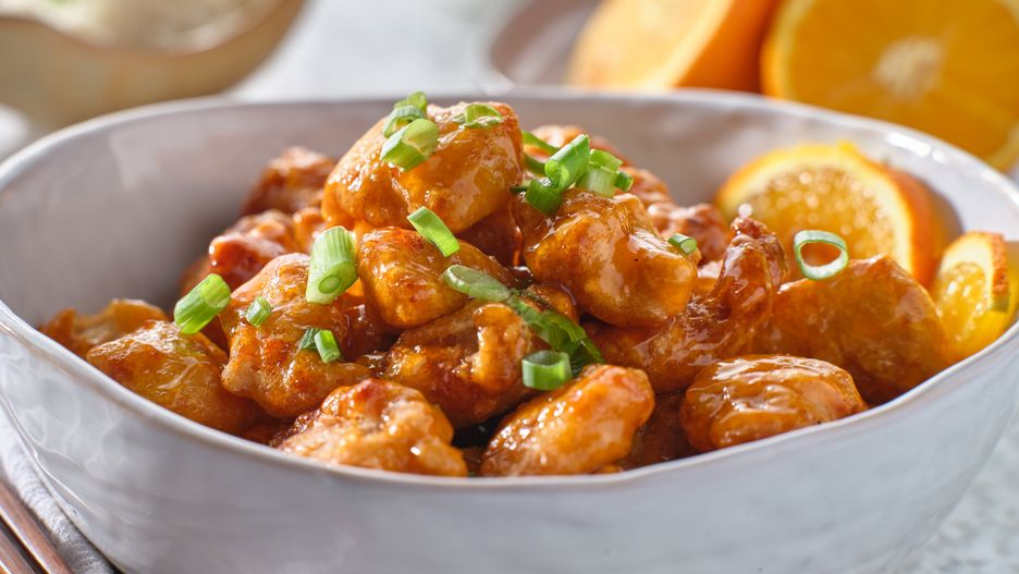 Tak przygotowany kurczak to klasyka kuchni chińskiej. Smażone na złoto kawałki kurczaka smakowicie oblepia sos na bazie soku pomarańczowego z dodatkiem kilku klasyków znanych z dań azjatyckich, takich jak cukier trzcinowy czy ocet ryżowy. Pikanterii dodają przyprawy – czosnek, korzeń imbiru i płatki chili.