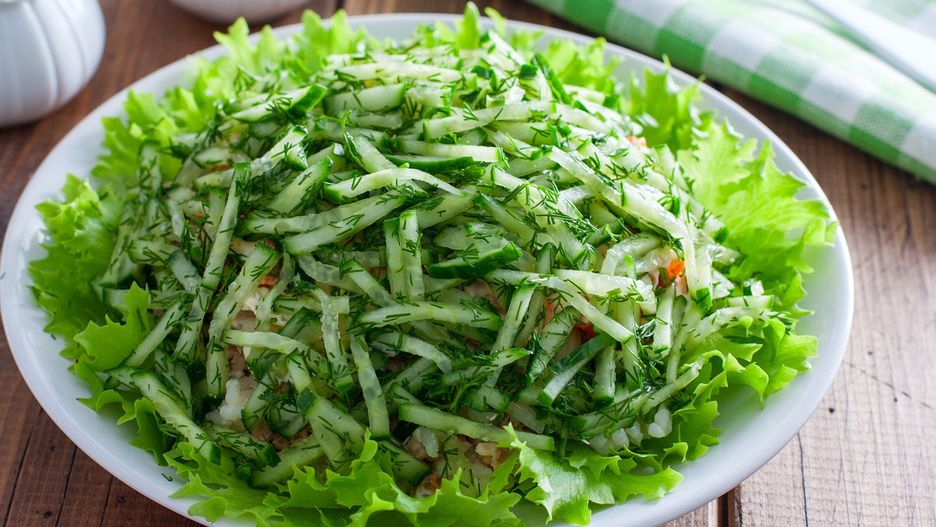 Na dnie półmiska rozłóż liście sałaty, tworząc bazę dla kolejnych warstw. Ugotowany ryż wymieszaj z odrobiną majonezu i rozprowadź na sałacie. Następnie rozdrobnij wędzonego łososia i ułóż go równomiernie na ryżu. Cebulę odcedź i rozłóż na łososiu, a następnie posmaruj warstwą majonezu. Kolejna warstwa to podsmażona marchewka, również pokryta cienką warstwą majonezu. Na koniec ułóż ogórka z koperkiem, tworząc dekoracyjną kopułę.
