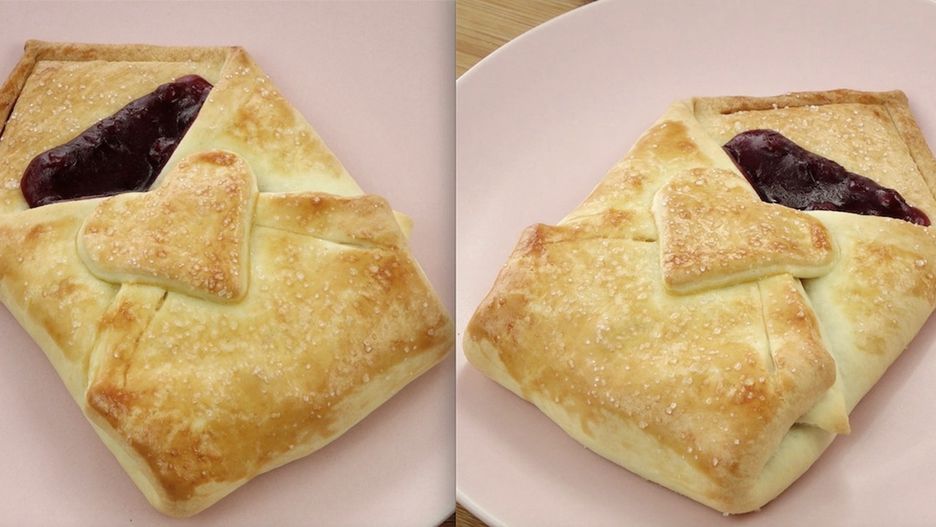 2. Ułóż romb tak, jak na poniższym zdjęciu, a następnie nałóż nadzienie o smaku borówki leśnej. Zawiń ciasto w kopertę.