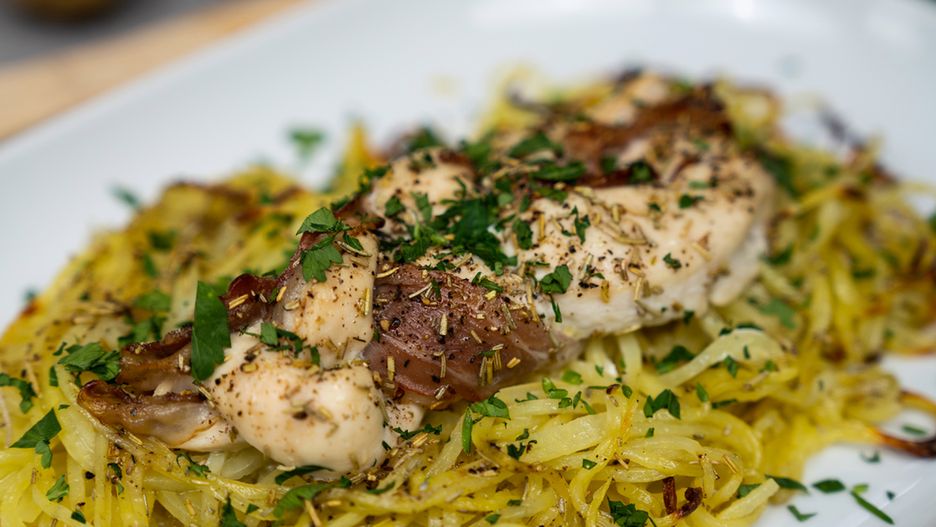 Jeśli brakuje Ci pomysłu na podanie piersi z kurczaka- spieszymy z pomocą. Klasyczne obiadowe połączenie, ziemniaki i filet, podaliśmy w nieco innej formie. Największym plusem tego przepisu jest to, że jest banalnie prosty, a efekt końcowy robi wrażenie. Plastry wędzonego boczku sprawiają, że mięso nie jest suche, a zyskuje jedynie na smaku i kruchości. Zamiast tradycyjnych gotowanych ziemniaków i frytek zaserwowaliśmy do tego pieczony makaron z ziemniaka.