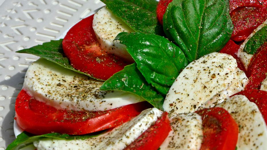 - Ułóż je na półmisku, przekładaj je listkami bazylii.