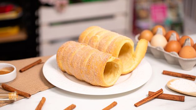 - Rozwałkuj, pokrój na długie paski i owiń na wałek. Przed pieczeniem obtocz w cukrze z cynamonem.