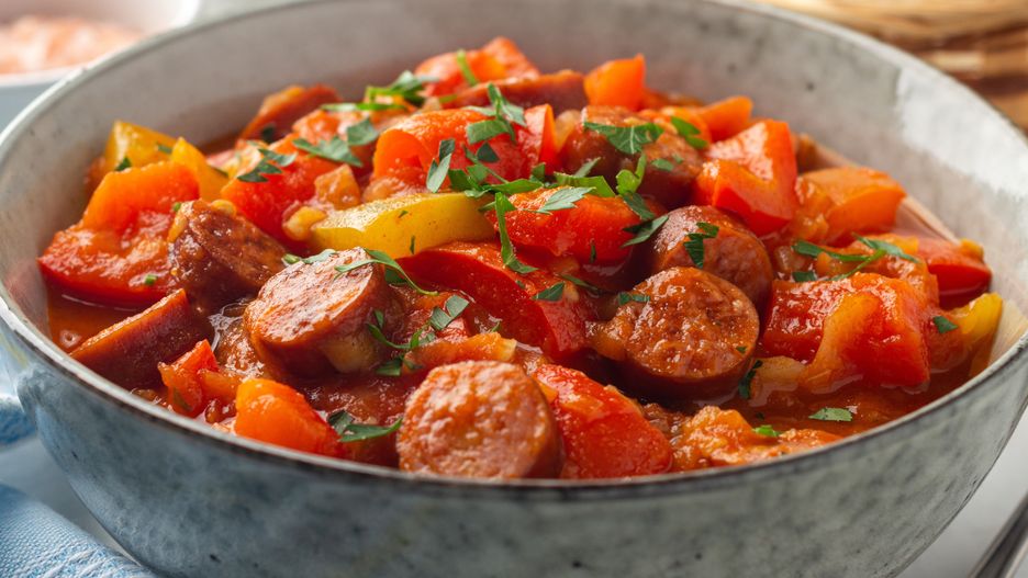 Do leczo wybierz dobrze doprawioną kiełbasę, na przykład kolbasz, która w smaku przypomina nieco hiszpańskie chorizo, ale jest bogatsza w wędzone aromaty. Wybierz mięsiste pomidory, ale przed wrzuceniem do garnka sparz je i obierz ze skórki.