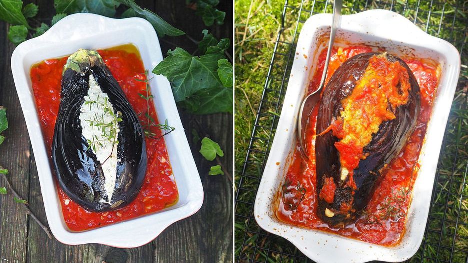 - Nadzienie włóż w środek bakłażana i ułóż go w formie na sosie pomidorowym. Polej oliwą, posyp solą i pieprzem, ułóż na wierzchu gałązki tymianku.
