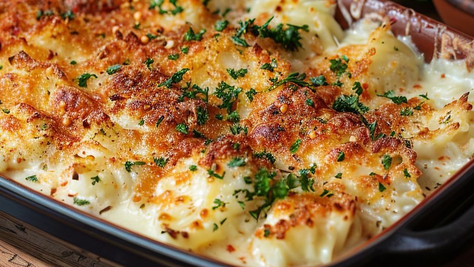 - Całość przełóż do natłuszczonej formy, piecz w 180 stopni Celsjusza przez ok. 30–35 minut, aż zapiekanka się zarumieni i będzie ścięta. Po wyjęciu z piekarnika posyp świeżą natką pietruszki.