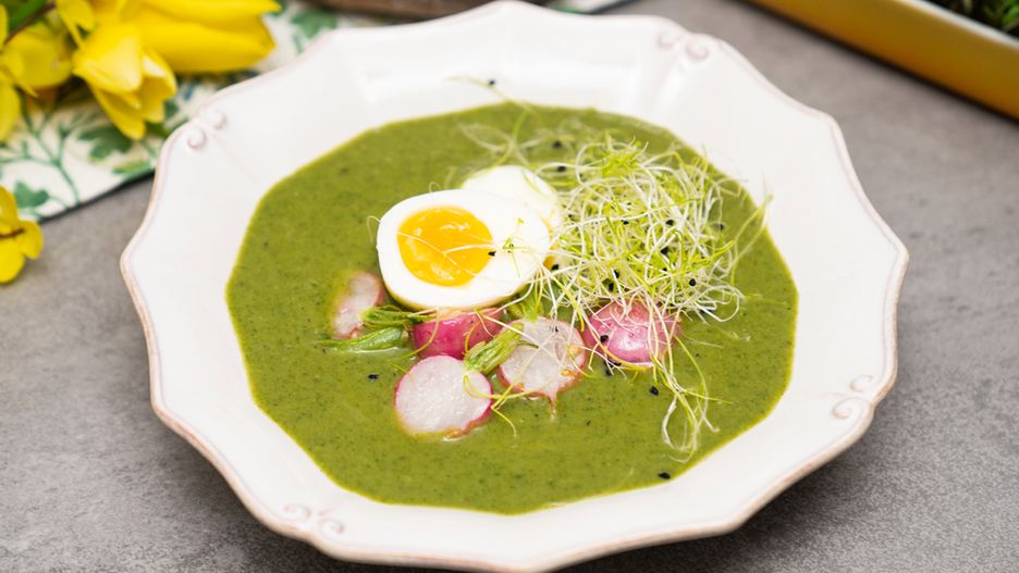 Do talerza nalej porcję przygotowanej zupy. Dorzuć połówkę ugotowanego jajka, podsmażone rzodkiewki oraz rzeżuchę. Wiosenny krem w pięknym, zielonym wydaniu jest już gotowy.