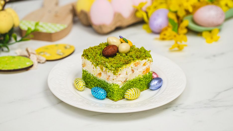 Wielkanocne ciasto łączka ze szpinakowym biszkoptem i mascarpone. Goście będą zachwyceni