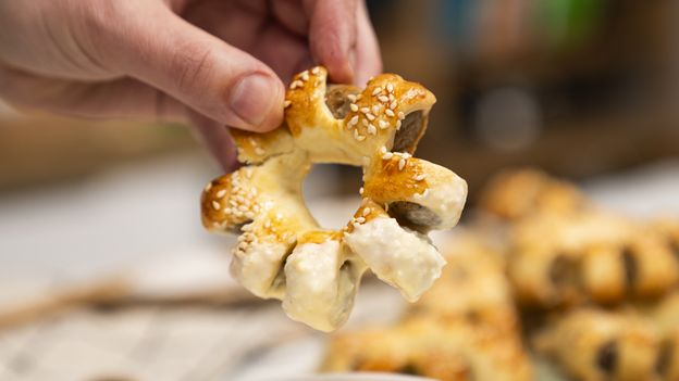 - Teraz owiń kiełbaskę dokładnie ciastem. Zbędną część ciasta ponownie odetnij. Dodatkowo przez długość całego boku zrób małe pionowe nacięcia. Umożliwi to złożenie kiełbaski w kształt przypominający stokrotkę. Dokładnie cały ten proces pokazujemy w naszym wideo.
